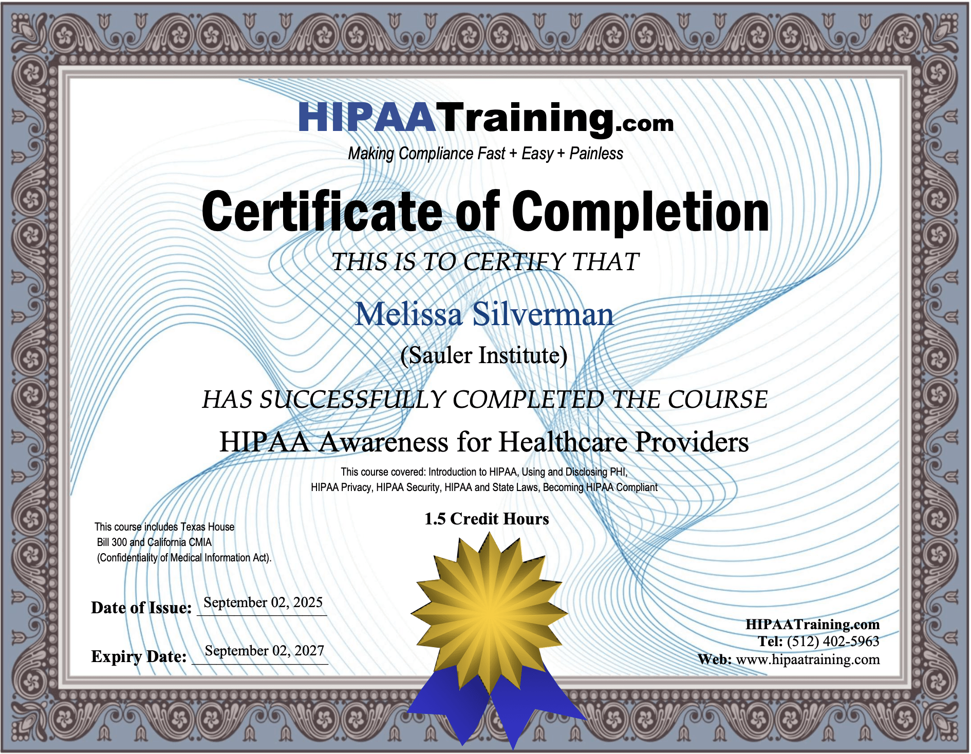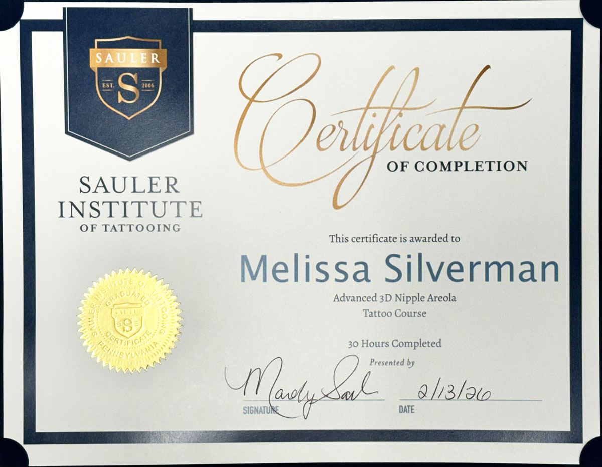 HIPAA CertificationHIPAA certification entails training individuals or auditing organizations on the Privacy Rule, Security Rule, and Breach Notification Rule to ensure protected health information (PHI) is secured. While not legally mandated by the HHS, it demonstrates a good faith effort toward compliance. We take our patients & clients privacy seriously regardless of the type of procedure we provideAdvanced 3d Nipple Areola TattoosCertified by the Sauler Institute of Tattooing– established in 2006 in Pennsylvania in collaboration with Penn State University’s Milton S. Hershey Medical Center. Comprehensive instruction by Mandy Sauler and Monica Madrigale-Barnes